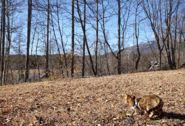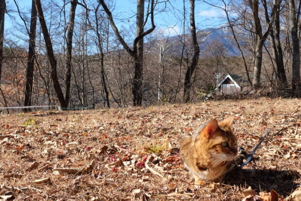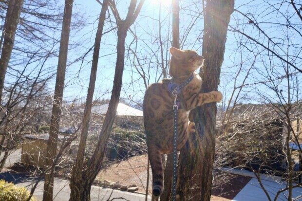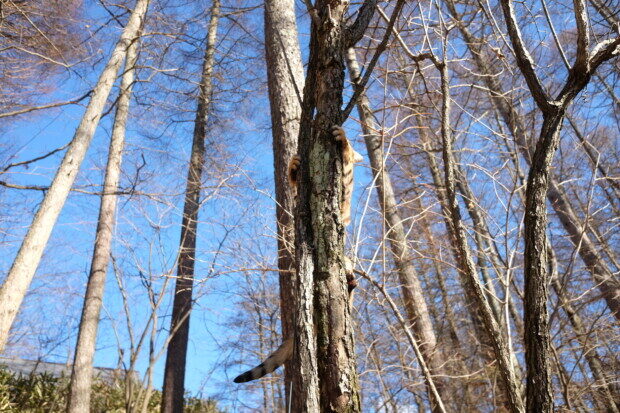かなり急な、ウチの南斜面を登りがてら、「木登り」するが、最近のお気に入りアトラクションです〜