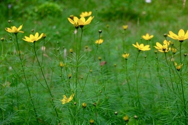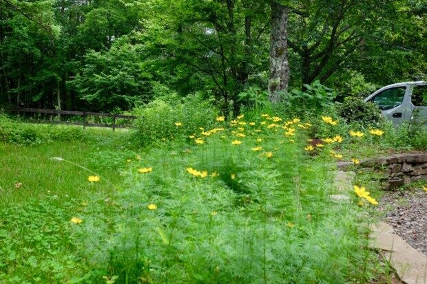 どこからか種が飛んで来て、群生した黄色い花が今年も満開となり、