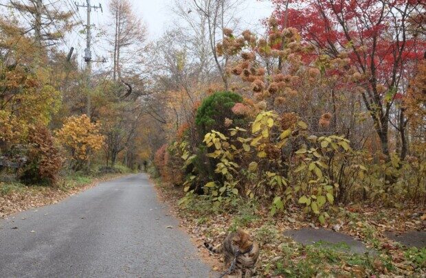 枯葉色に染まった近所を、ベンガル・ピノちゃんとお散歩。