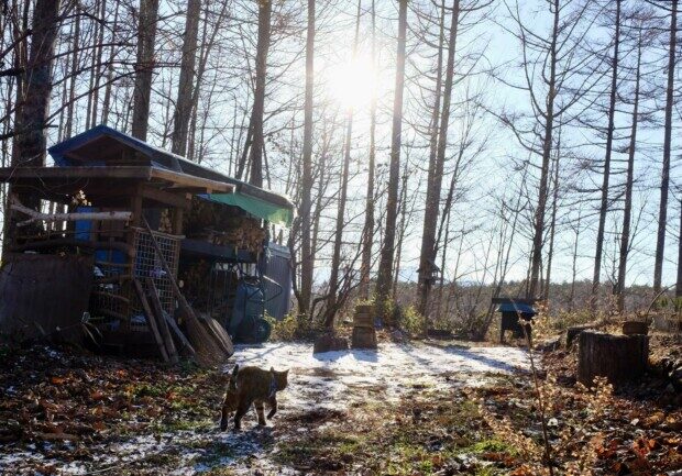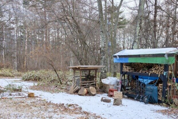 積もるほどの雪ではありませんが、ついに本格的な「寒さ」到来で、午前中、伐採木を運んで来てくれた「天女山」の方は、まるでスキーに行くような重装備でした(笑)。
