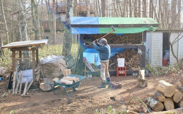 今日1月5日は少し寒さが緩んだので、旦那さん、初「薪割り」をしてました〜